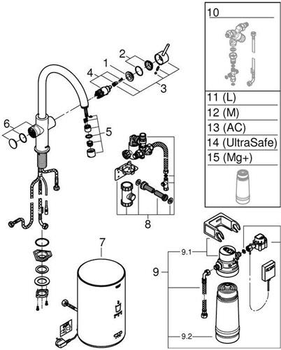 Einlochmontage · ChildLock Drucktasten für kochendes Wasser · TÜV zertifizierte elektronische Sicherung gegen versehentliches Aktivieren · StarLight Oberfläche · SilkMove 28 mm Keramikkartusche · isolierter Rohrauslauf · Schwenkbereich 150° · getrennte Wasserwege · flexible Anschlussschläuche · Hochdruckboiler für kochendes und warmes Wasser · 3 l · 100° C kochendes Wasser · 4 l Gesamtkapazität · Betriebsdruck: 1-7 bar · mit flexiblem Anschlussschlauch und Abgang für kochendes Wasser · Anschlussspannung 230 V 50 Hz · Leistungsaufnahme 2100 W · Leistungsaufnahme Standby 15 W · Red Filterset zum Schutz des Boilers vor Verkalkung · Kapazität 600 l bei 20° dKH · 5-Phasen-Filter · Durchflussmesser