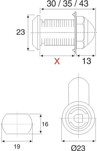 mit Mutterbefestigung · Schließweg 90º, Schließhebel 35 mm lang, umstellbar · Zylinder-Ø 18 mm · Zamak vernickelt · Zylinder montiert · 2 Schlüssel · Stärke = X