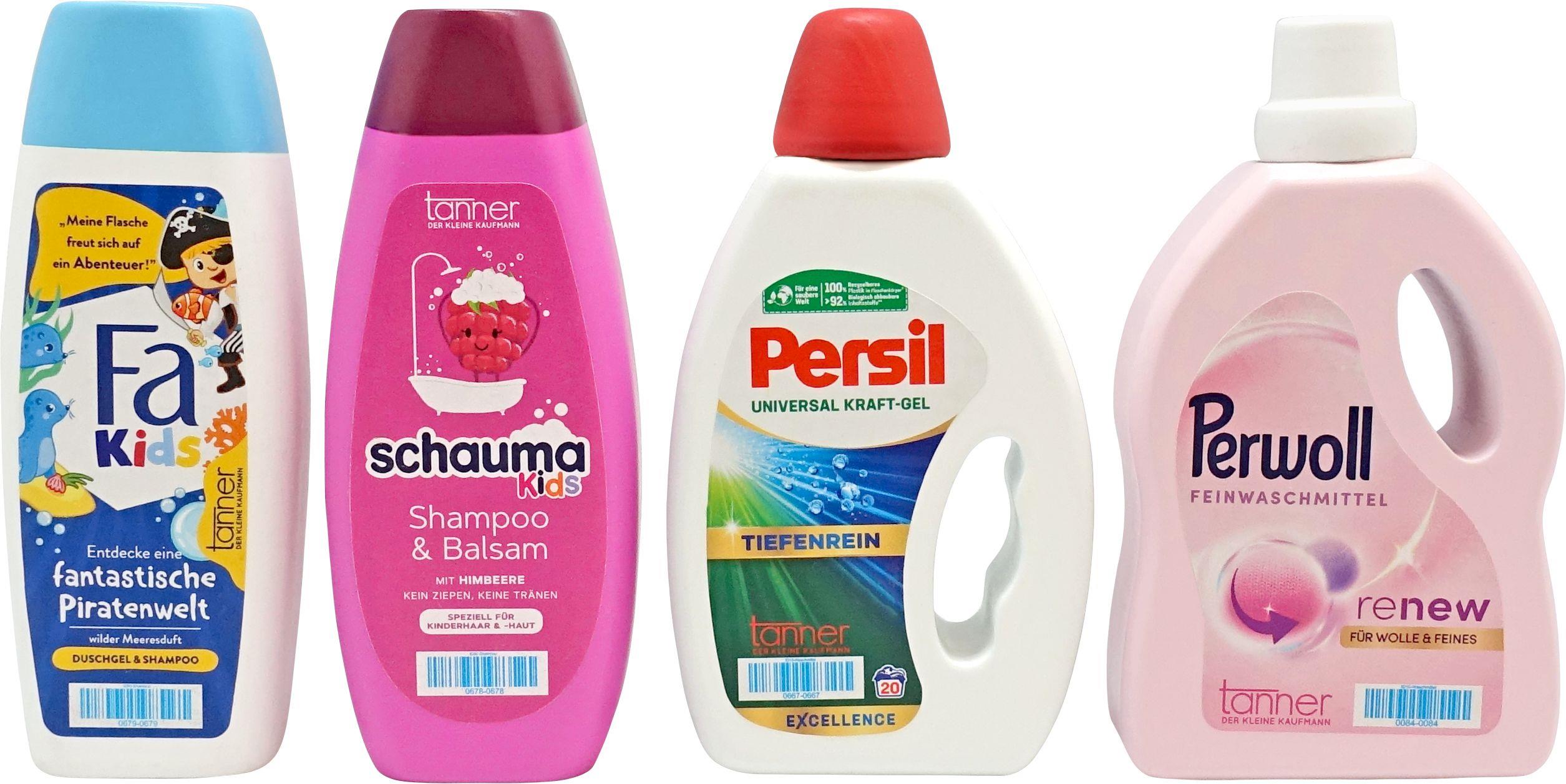 4 Miniaturen in authentischem Design der bekannten Produkte Schauma Kids, Fa Kids, Persil Waschmittel und Perwoll Feinwaschmittel der Marke Henkel aus robustem Holz.
