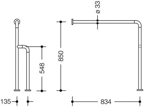 mit durchgehendem · korrosionsgeschütztem Stahlkern · links- und rechtsseitig montierbar · Befestigung an Wand und Boden mit Befestigungsmaterial von HEWI · 135 mm tief · Rosetten Ø 70 mm · aus Polyamid