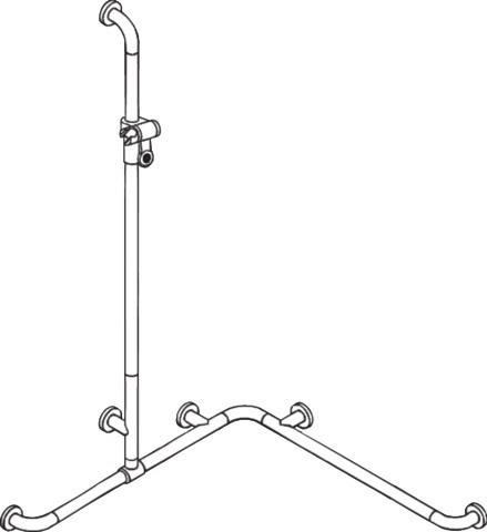 verschiebbare Brausehalterstangewaagerecht und senkrecht angeordnete · im rechten Winkel verbundene Stangen mit Brausehalter und Befestigungsrosetten · mit seitlich (zur Montage) verschiebbare Brausehalterstange · Brausehalter kann stufenlos geneigt und in der Höhe verstellt werden · mit Aluminiumkern · stahlverstärkten Endbögen und Kunststoff-Befestigungsrosetten · Montage an der Wand mit Befestigungsmaterial von HEWI · links- und rechtsseitig montierbar · waagerecht je 762 mm · 90 mm tief · Stangen Ø 33 mm · Rosetten Ø 70 mm · für Einhängesitz geeignet · aus Polyamid