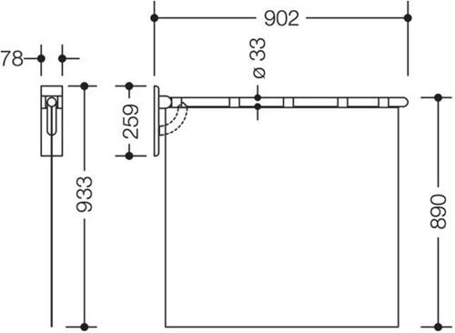 waagerecht angeordnete Stange mit Duschvorhang · kann nach oben und gebremst nach unten geklappt werden · links und rechtsseitig verwendbar · mit durchgehendem · korrosionsgeschütztem Stahlkern · Wandplatte aus Polyamid mit integriertem Stahlkern · verdecktes · korrosionsfreies und geprüftes HEWI Befestigungsmaterial für unterschiedliche Wandaufbauten · Gesamthöhe mit Vorhang 890mm · Ausladung 902 mm · 78 mm breit · 259 mm hoch und Ø 33 mm · aus Polyamid · Duschspritzschutzvorhang: mit gesäumten Seiten und Edelstahl- bzw. Bleiband im Rollsaum unten · wird mit Laschen an der Stange befestigt · bei 30 °C waschbar und 60 °C desinfizierbar · Ausrüstung gegen Schimmelpilz und Stockflecken · 880 mm breit und 850 mm hoch · duschdicht
