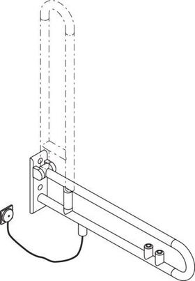 zwei parallele · übereinander angeordnete · durch einen Verbindungsbogen zusammengefügte Stangen mit zwei integrierten Tasten · belastbar nach DIN 18040 bis 100 kg · kann nach oben und gebremst nach unten geklappt werden · mit durchgehendem · korrosionsgeschütztem Stahlkern und Wandplatte aus Polyamid mit integriertem Stahlkern · verdecktes · korrosionsfreies und geprüftes HEWI Befestigungsmaterial für unterschiedliche Wandaufbauten (bitte separat bestellen) · 78 mm breit und 259 mm hoch · Stangen Ø 33 mm · Taste mit blauem Ring zum Auslösen der WC-Spülung · Taste mit rotem Ring zum Auslösen einer frei definierbaren Funktion · Tasten mit Schutzart IP67 · Spiralkabel mit freien Leitungsenden für Wandanschluss · inkl. weißer Abdeckung für Unterputzdose · Steuerspannung max. 30 V = SELV · PELV · Schaltstrom bis max. 2A · passend für alle gängigen UP-Spülkästen mit elektr. Steuerung · aus Polyamid