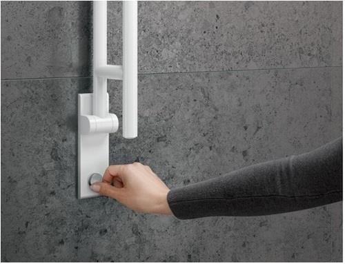 zwei parallele · übereinander angeordnete · durch einen Verbindungsbogen zusammengefügte Stangen · belastbar nach DIN 18040 bis 100 kg · kann nach oben und gebremst nach unten geklappt und in hochgeklappter Stellung nach links oder rechts zur Wand gedreht werden · mobil einsetzbar · zum einfachen und flexiblen Nachrüsten auf bestehender · vormontierter Montageplatte 950.50.016 (bitte separat bestellen) · werkzeuglose und schnelle Montage durch einfaches Einhängen des Stützklappgriffs · gegen unbeabsichtigtes Herausziehen mit Befestigungsschraube gesichert · verdecktes · korrosionsfreies und geprüftes HEWI Befestigungsmaterial für unterschiedliche Wandaufbauten (bitte separat bestellen) · 78 mm breit und 252 mm hoch · Stangen aus Polyamid · mit durchgehendem · korrosionsgeschütztem Stahlkern