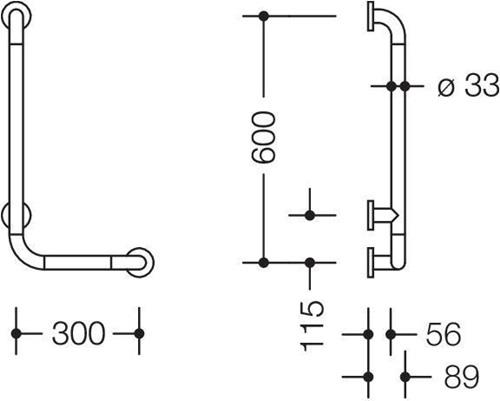 senkrecht und waagerecht angeordnete · im rechten Winkel verbundene Stangen mit Befestigungsrosetten · mit durchgehendem · korrosionsgeschütztem Stahlkern und Stahl-Befestigungsrosetten · links- und rechts montierbar · Montage an der Wand mit Befestigungsmaterial von HEWI · Rosetten Ø 70 mm · aus Polyamid