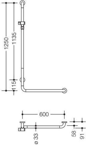senkrecht und waagerecht angeordnete · im rechten Winkel verbundene Stangen mit Befestigungsrosetten und Brausehalter · Brausehalter kann stufenlos geneigt und in der Höhe verstellt werden · konische Aufnahme am Brausehalter erleichtert das Einhängen der Handbrause · mit Aluminiumkern · stahlverstärkten Endbögen und Kunststoff-Befestigungsrosetten · Montage an der Wand mit Befestigungsmaterial von HEWI · links- und rechtsseitig montierbar · senkrechte Länge 1250 mm · waagerechte Länge 600 mm · 90 mm tief · Rosetten Ø 70 mm · für Einhängesitz geeignet · aus Polyamid