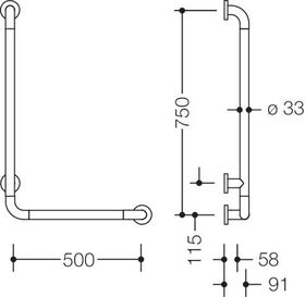 senkrecht und waagerecht angeordnete · im rechten Winkel verbundene Stangen mit Befestigungsrosetten · mit Aluminiumkern · stahlverstärkten Endbögen und Kunststoff-Befestigungsrosetten · links- und rechtsseitig montierbar · Montage an der Wand mit Befestigungsmaterial von Hewi · 90 mm tief · Stangen Ø 33 mm · Rosetten Ø 70 mm · aus Polyamid · erfüllt Ö-Norm B1600/1601