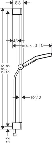 • besteht aus: Handbrause · Brausestange · Brauseschlauch · Handbrausehalterung _x000d_• Brausekopfgröße: 130 mm _x000d_• Strahlart: MonoRain · PowderRain · Intense PowderRain _x000d_• komfortable Strahlartenumstellung durch Select-Taste_x000d_• mit Rückflussverhinderer_x000d_• brauseseitiger Drehwirbel gegen lästiges Verdrehen des Brauseschlauches_x000d_• Wandbefestigung: Schraubbefestigung _x000d_• höhenverstellbare Handbrausehalterung mit Push Schieber_x000d_• Gesamtllänge Brausestange: 959 mm_x000d_• Brausestangendurchmesser: 22 mm _x000d_• Profil Brausestange: rund _x000d_• Bohrabstand 915 mm