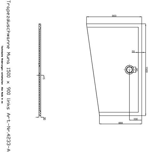 Hoesch Duschwanne MUNA links, mit Antirutsch 1500x900x30mm weiß