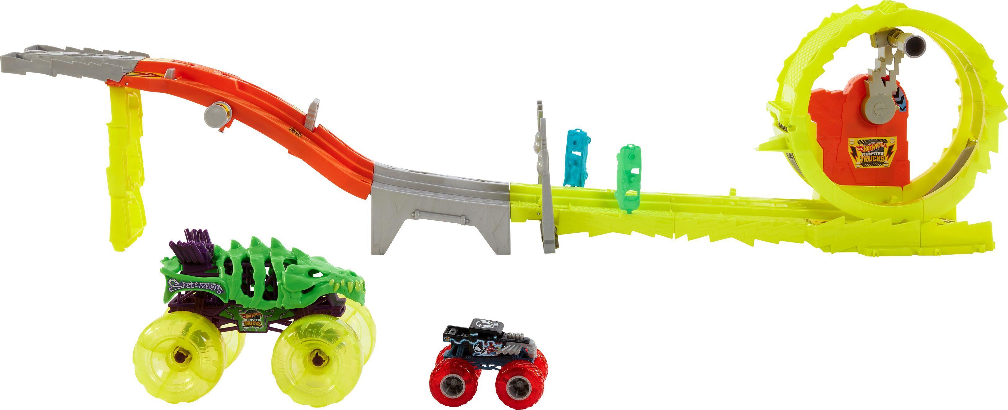 Ein extragroßer Skelesaurus und 1 Bone Shaker im Maßstab 1:64 stellen sich in einem Rennen, um Zerstörung zu vermeiden. Die beiden Fahrzeuge können mit dem Ein-/Ausschalter gestartet werden, um zu sehen, ob der Bone Shaker bei einem Rennen den Hügel hinab in Richtung eines riesigen Loopings den Bösewicht schlagen kann. Es wird nach dem Zufallesrinzip eines von zwei Ergebnissen ausgewählt: Der Bone Shaker schafft es durch den Looping und entkommt, während der Skelesaurus auf der Strecke bleibt. Oder der Skelesaurus fängt seine Beute und setzt den Bone Shaker im Looping fest, sodass er umfällt. Das Set enthält zwei zerdrückte Autos für noch mehr Zerstörung. Abweichungen in Farbe und Gestaltung vorbehalten.