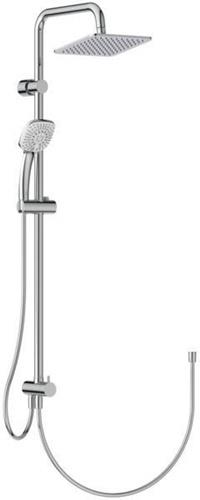 Kopfbrause aus Metall 200 x 200 mm und 3-Funktionshandbrause 100 x 100 mm (Strahlarten: Regen · Platzregen und Massagestrahl) · Antikalk-Funktion · wasserführende Brausestange mit schwenkbarem Druckknopf-Schieber