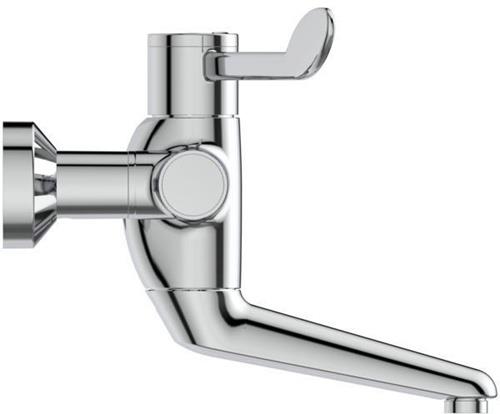 DN 15 · Bedienungshebel aus Metall Länge 200 mm · mit permanenter Rot/Blau Markierung · dreifach einstellbarer Gussauslauf · fixiert · nicht fixiert · +/- 45 Grad · Auslauflänge 150 mm · mit Strahlbrecher · laminarer Wasserstrahl · thermostatisch gesicherte Drehsicherheitskartusche mit einstellbarer Temperaturbegrenzung · Verbrühschutz und thermischer Desinfektion · öffnet rechts drehend über Kalt nach Warm · thermische Desinfektion nur mit Spezialwerkzeug möglich (im Lieferumfang enthalten) · absperrbare S-Anschlüsse und Überwurfmutter verdeckt · Rosetten mit Wandabdichtung · thermische Entkopplung des Armaturenkörpers von der Warm- und Kaltwasserleitung · verringertes Aufheizen des Armaturenkörpers während der Nutzung. Verminderung der Wärmeübertragung von der Warmwasserleitung durch den Armaturenkörper auf die Kaltwasserleitung bei geschlossener Armatur · Reduzierung des Wasserinhaltes im Körper durch kleine glatte Wasserwege ermöglichen eine hohe Fließgeschwindigkeit und somit eine Reduzierung des Biofilmes · Lebensdauertest EN 1111 · Geräuschverhalten DIN 4109 · Gruppe 1