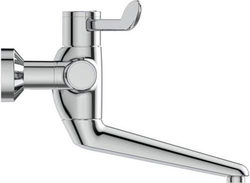 DN 15 · Bedienungshebel aus Metall Länge 200 mm · mit permanenter Rot/Blau Markierung · dreifach einstellbarer Gussauslauf · fixiert · nicht fixiert · +/- 45 Grad · Auslauflänge 200 mm · mit Strahlbrecher · laminarer Wasserstrahl · thermostatisch gesicherte Drehsicherheitskartusche mit einstellbarer Temperaturbegrenzung · Verbrühschutz und thermischer Desinfektion · öffnet rechts drehend über Kalt nach Warm · thermische Desinfektion nur mit Spezialwerkzeug möglich (im Lieferumfang enthalten) · absperrbare S-Anschlüsse und Überwurfmutter verdeckt · Rosetten mit Wandabdichtung · thermische Entkopplung des Armaturenkörpers von der Warm- und Kaltwasserleitung · verringertes Aufheizen des Armaturenkörpers während der Nutzung. Verminderung der Wärmeübertragung von der Warmwasserleitung durch den Armaturenkörper auf die Kaltwasserleitung bei geschlossener Armatur · Reduzierung des Wasserinhaltes im Körper durch kleine glatte Wasserwege ermöglichen eine hohe Fließgeschwindigkeit und somit eine Reduzierung des Biofilmes · Lebensdauertest EN 1111 · Geräuschverhalten DIN 4109 · Gruppe 1