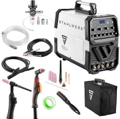 Das STAHLWERK AC/DC WIG 200 Puls CUT ST ist ein multifunktionales WIG-Schweißgerät mit Plasmaschneidfunktion und MMA- bzw. Elektroden-Schweißfunktion. Einer der vielen Vorteile dieses 3-in-1-Kombi-Schweißgeräts ist die kompakte Bauform sowie das geringe Gewicht von nur 13 kg.Mit der Plasmaschneidfunktion ist das Trennen von Materialstärken von bis zu 12 mm bei 50 Ampere möglich. Das AC/DC WIG 200 Puls CUT ST besitzt eine umfangreiche Pulsfunktion · die unter anderem das Schweißen von Dünnblech erleichtert. Parameter wie Impulsstrom · Impulsfrequenz · Long- und Shortpuls sind komfortabel einstellbar. Die fernsteuerbare Stromregelung am Schweißbrenner oder Fußpedal (optional erhältlich) bietet Ihnen den Vorteil · dass Sie den Strom auch während des Schweißvorgangs regeln können. Modernste IGBT-Technologie ermöglicht Höchstleistung beim WIG- und E-Hand-Schweißen sowie beim Plasmaschneiden.