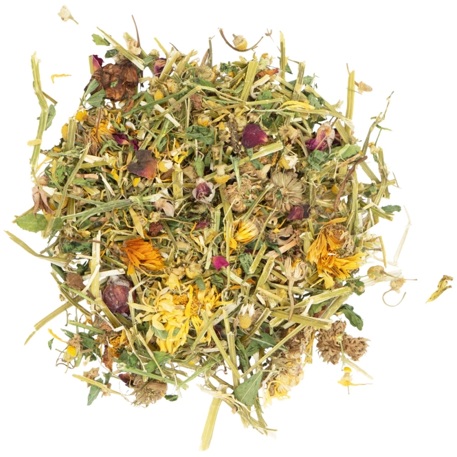 Ein betörender Mix aus wertvollen Blüten, Luzerne und Kräutern möchte auch deine Heimtiere verwöhnen.