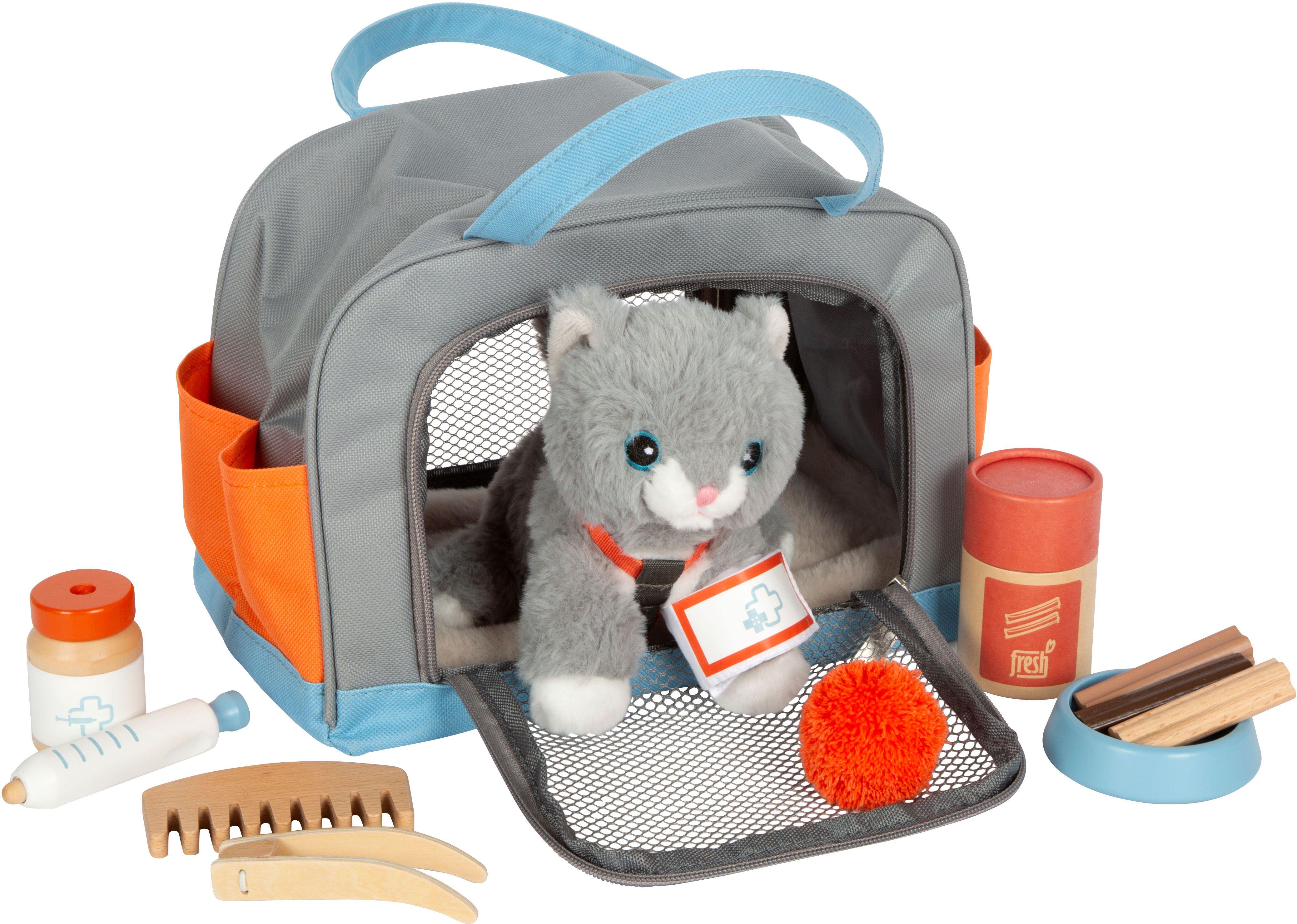 Das erste eigene Haustier! Mit diesem umfangreichen Haustier-Set zieht ein niedliches Kätzchen ins Kinderzimmer ein. Dabei kommt das plüschige Katzenbaby mit allem, was zur Haltung und Pflege einer Katze dazu gehört: Transporttasche, Katzenkissen, Futternapf, Leckerlies in wiederverschließbarer Dose, Kamm, Katzenspielzeug und sogar ein abnehmbares Katzengeschirr mit Öse zur Befestigung einer Leine, um mit der niedlichen Katze Spazieren zu gehen. Pinzette, Verband mit Klettverschluss sowie Medizinfläschchen und Spritze mit Drückmechanismus und beweglicher Spitze ergänzen das umfangreiche Set und ermöglichen es, realitätsnahe Tierarzt-Situationen nachzuspielen. Dank der praktischen Transporttasche kann die Katze mitsamt Zubehör überall hin mitgenommen werden – für fantasievolles Rollenspiel auch unterwegs! Füttern, pflegen, spielen, verarzten – die Plüschkatze mit Pflege-Set ermöglicht unterschiedliche Spielszenarien und lädt zum kreativen Rollenspiel ein. Dank des umfangreichen Zubehörs ist das Spiel-Set sofort spielbereit. Bei der Pflege der Katze trainieren Kinder wichtige sozial-emotionale Kompetenzen und üben spielerisch einen verantwortungsvollen Umgang mit einem Lebewesen.