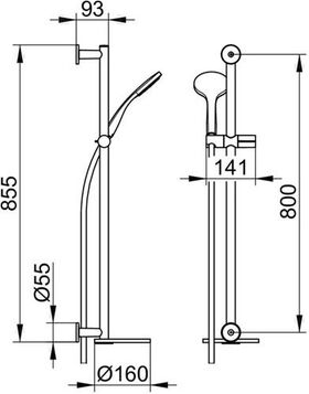 Brausestange (595850109x2): 855 mm · Rosetten rund · mit Brauseschieber für Schläuche mit konischer Mutter · Position Brausehalter wahlweise links oder rechts verwendbar · Neigungswinkel verstellbar · mit Fliesenausgleichscheibe (5 mm) · Ablage schwenkbar · Handbrause (59580010100): Anschlussart G 1/2? · Normalstrahl · mit Antikalk-System · mit ECO AIR System · Durchflussmenge 11 l/min · für Durchlauferhitzer geeignet · Brauseschlauch (54995011600): 1600 mm · Anschlussart G 1/2? · beidseitig konische Mutter · beidseitig verdrehgesichert · Kunststoffschlauch · mit Knickschutz