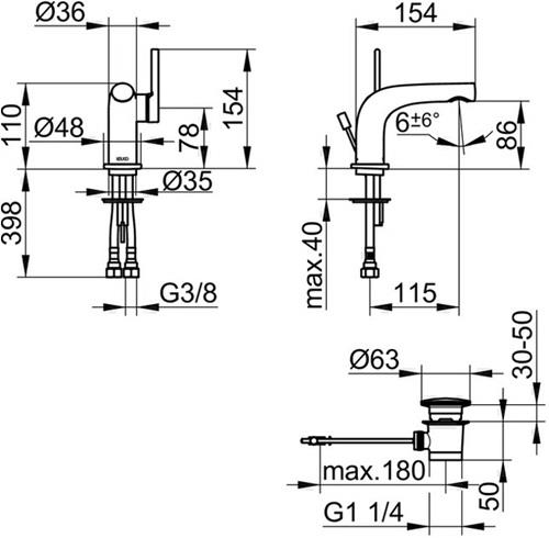 Auslaufhöhe 86 min · Ausladung 115 mm · Einlochmontage mit Schnell-Montagesystem · Anschlussart Anschlussschläuche G 3/8? · Mischwasserkartusche mit keramischen Dichtscheiben · Luftsprudler M 24 x 1 · Strahlwinkel +/- 6° verstellbar · Durchflussmenge 7,6 l/min · für Durchlauferhitzer geeignet · geräuschgeprüft