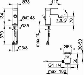 Auslaufhöhe 70 mm · Ausladung 110 mm · Rosettenform rund/eckig · Einlochmontage mit Schnell-Montage-System · Anschlussschläuche G 3/8? · Mischwasserkartusche mit keramischen Dichtscheiben · Kugelgelenk-Luftsprudler M 18,5 x 1 · Strahlwinkel +/- 20° verstellbar · Durchflussmenge begrenzt auf 7,6 l/min · für Durchlauferhitzer geeignet · geräuschgeprüft