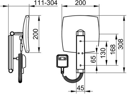 mit Spiralkabel und Kabelschalter · Wandmodell · Lichtfarbe 6500 Kelvin (Tageslicht) · an dreidimensional verstellbarem Schwenkarm · Spiegel 1-seitig · Vergrößerungsfaktor x 5 · Stromversorgung Netzanschluss über Steckernetzteil · 12 V · Eingangsbereich 220-240 V · LED 4,5 Watt