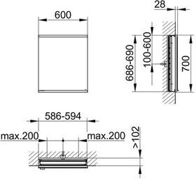 Wandeinbau · 1x Drehtür aus Kristall-Doppelspiegel mit Anschlagsdämpfung · Anschlag rechts · Korpus Aluminium silber-gebeizt-eloxiert · Rückwand aus rückseitig weiß lackiertem Glas · 3 bzw. 4 höhenverstellbare Glasablagen · LED (18-22 Watt) · stufenlos einstellbare Lichtfarbe von 2700 Kelvin (warmweiß) bis 6500 Kelvin (Tageslicht) · Ober- und Unterbeleuchtung separat schalt- und dimmbar · DALI-steuerbar · Tastenfelder mit kapazitiver Touch-Sensorik · ohne Steckdose