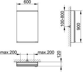 Wandvorbau · 1x Drehtür aus Kristall-Doppelspiegel mit Anschlagsdämpfung · Anschlag links · Korpus Aluminium silber-gebeizt-eloxiert · Seiten verspiegelt · Rückwand aus rückseitig weiß lackiertem Glas · 3 bzw. 4 höhenverstellbare Glasablagen · LED (18-22 Watt) · stufenlos einstellbare Lichtfarbe von 2700 Kelvin (warmweiß) bis 6500 Kelvin (Tageslicht) · Ober- und Unterbeleuchtung separat schalt- und dimmbar · DALI-steuerbar · Tastenfelder mit kapazitiver Touch-Sensorik · ohne Steckdose