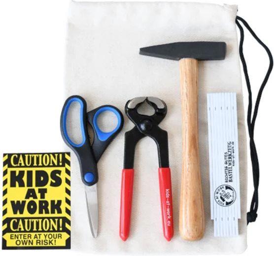 Kinder-Werkzeugset bestehend aus Hammer, Zwickzange, Meterstab und Schere – perfekt abgestimmt auf kleine Kinderhände. Inklusive praktischem Baumwollbeutel zur Aufbewahrung und einem kleinen Schild zum Markieren der "Kinderbaustelle". Ideal für erste handwerkliche Abenteuer!