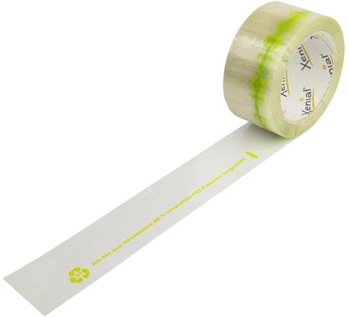 Umweltfreundliches Klebeband mit Aufdruck ?Ich bin aus mindestens 85 % recycelten PET-Flaschen hergestellt? zeigt dem Empfänger · dass Sie umweltbewusst agieren! Niedriger CO2-Fußabdruck Zu mindestens 85 % aus recycelten PET-Flaschen hergestellt Recyclingfähig Kern aus recyceltem Papier Zuverlässiger und dauerhafter Verschluss für mittelschwere Kartonagen bis ca. 22 kg Weniger Rollenwechsel dank 100 lfm./Rolle Sehr gute Klebkraft Lösungsmittelfreier Hotmeltkleber Gute Feuchtigkeits- und Witterungsbeständigkeit Hitzebeständig kurzfristig bis ca. +170 °C Reißkraft: mind. 40 N/cm Klebkraft auf Stahl: mind. 5 N/cm EU-patentierte Qualität