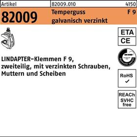 Artikel 82009 Temperguss F 9 galvanisch verzinkt LINDAPTER-Klemmen F 9 · zweiteilig · mit verzinkten Schrauben · Muttern u. Scheibe - Abmessung: M 10 / 19 - 42 VE=S (1 Stück)