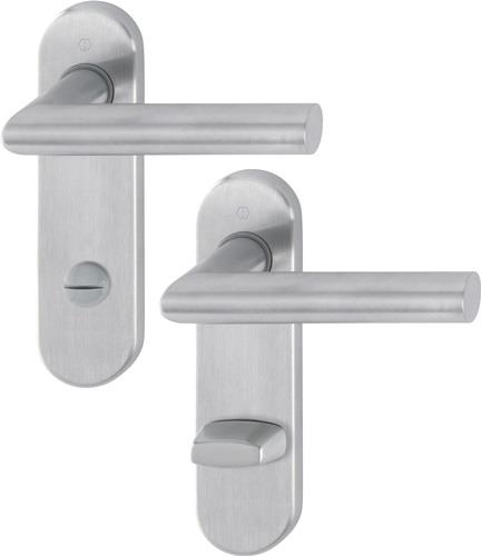 Innentür-Kurzschild-Garnitur geprüft nach DIN EN 1906 (Gebrauchs-Kategorie Klasse 3) · Türgriffe mit Schnellstift-Verbindung (mit 8 mm Vollstift) für Türstärke 35-45 mm · Schilder mit Stahl-Unterkonstruktion und Stütznocken · aufklippbare Abdeckschilder · verdeckte, lockerungssichere Verschraubung mit durchgehenden Gewindeschrauben · Anschlagrichtung DIN links / rechtsEntfernung 78 mm