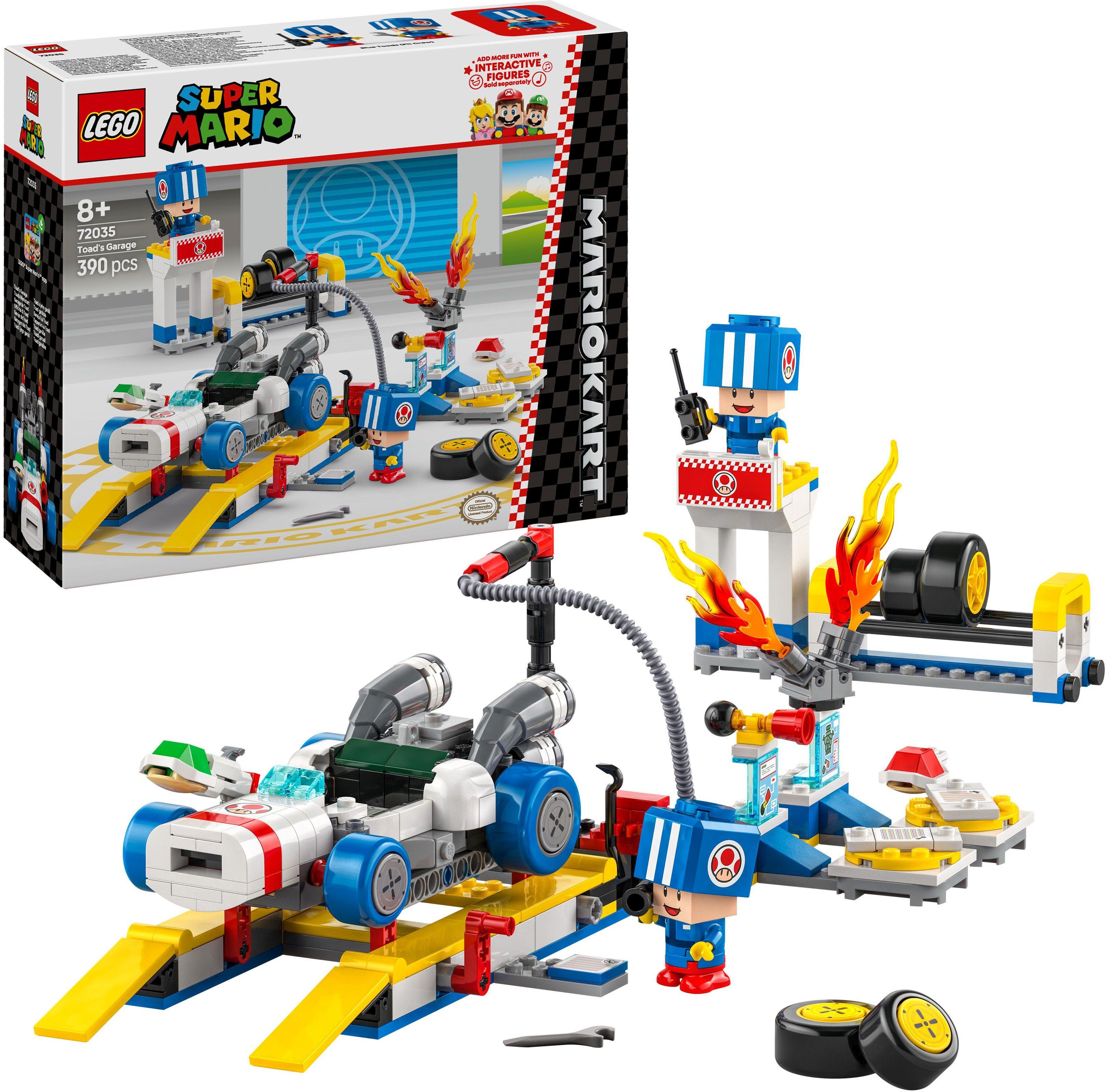 Lass Kinder in Toads Werkstatt in die Rolle der Boxencrew schlüpfen und den Boliden aufs Rennen vorbereiten. Dieses LEGO Super Mario: Mario Kart Spielset (72035) beinhaltet einen Nintendo Charakter und ist eine fantastische Geschenkidee für Jungen, Mädchen und Gamer ab 8 Jahren. Das Set beinhaltet 2 blaue Toad Figuren in blauen Boxencrew-Overalls, eine funktionierende Hebebühne und Werkzeug. Du hast die Wahl zwischen Standard-Reifen und Reifen in blau. Der Bolide verfügt über ein Panzer-Katapult. Und an den Anpassungsmaschinen können Baumeister eine Hupe und einen Motor montieren. Setz LEGO Mario, LEGO Luigi oder LEGO Peach (aus den separat erhältlichen Sets 71439, 71440 und 71441) in den Boliden, um interaktiv zu spielen und digitale Reaktionen beim Fahren, Driften und Schweben mit dem Boliden auszulösen. An den Anpassungsmaschinen kannst du Hup- und Motorengeräusche auswählen. Bauanleitungen zu diesem Nintendo Abenteuer Spielzeug findest du in der Box oder in der LEGO Super Mario App. Schau dir auch unbedingt die anderen separat erhältlichen LEGO Super Mario: Mario Kart Sets an. Das Werkstattmodul ist 11 cm hoch, 31 cm breit und 20 cm tief. Enthält 390 Teile.