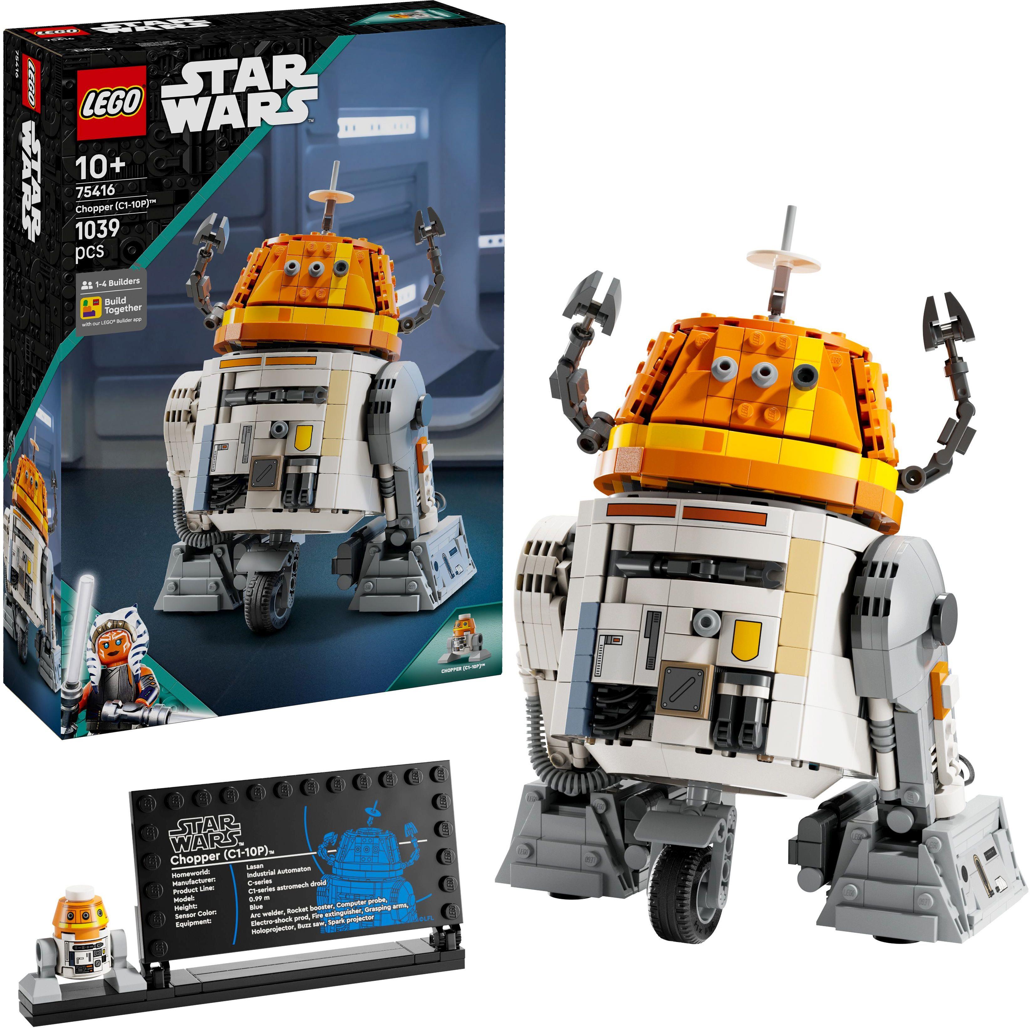 Das LEGO Star Wars Bauset (75416) lässt Kinder ein Modell des liebenswerten Astromech-Droiden Chopper (C1-10P) bauen und ausstellen. Die Figur Chopper aus Star Wars: Ahsoka hat viele originalgetreue Details und ist ein süßes Geburtstags- oder Ostergeschenk für Jungen, Mädchen und alle Fans ab 10 Jahren. Benutze den Hebel am Rücken, um seinen Kopf die legendären Bewegungen machen zu lassen. Bewege seine Arme und Beine und lass ein Werkzeug aus der Brust herausklappen. Man kann Choppers Arme und sein mittleres Rad abnehmen, damit es den Anschein hat, er hätte die Arme und das Rad in seinen Körper eingefahren. Dieses LEGO Star Wars Set zum Sammeln, Bauen und Ausstellen wird vom LEGO Droiden Chopper in Normalgröße vervollständigt, der neben die Infotafel gestellt werden kann. Schon ist der spektakuläre Blickfang fertig. Gemeinsam bauen – mit Freunden und mit der Familie: Die LEGO Builder App bietet ein tolles Gemeinschaftserlebnis beim Bauen des Sets. Der Droide Chopper ist 22 cm groß. Enthält 1039 Teile.