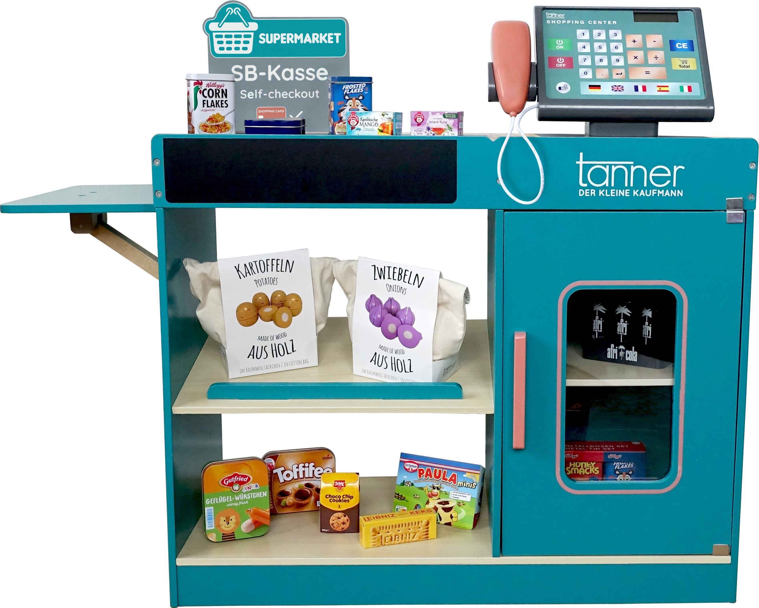 inkl. Kassensystem und Markenminiaturen. Aus hochwertigem Holz mit echten Supermarktfunktionen für unvergessliche Einkaufserlebnisse in jedem Kinderzimmer! Kinder können an der Supermarkt-Theke mit anderen Kindern zusammen spielen oder aber auch alleine in tolle Supermarkt- Spiele eintauchen, indem die Kassenstation ganz einfach zu einer Selbstbedienungskasse wird! Beinhaltet eine Tanner Scannerkasse, die schnell und unkompliziert in die Supermarkt-Fläche gesteckt werden kann. Die Tanner Scannerkasse besitzt eine echte Scanfunktion sowie Rechen- und Sprachfunktionen in 5 verschiedenen Sprachen: Deutsch, Englisch, Französisch, Spanisch und Italienisch. Umwandlung der Supermarkt-Theke zur Selbstbedienungskasse: Die Tanner Scannerkasse aus der Theke herausnehmen und umgedreht wieder anbringen, sodass das Kind nun auf der Vorderseite des Supermarktes stehen, Einkäufe auf das Kassenband legen und Produkte scannen kann! Ausklappbares Brett an der Seite der Theke zum Abstellen des vollen Einkaufskorbes. Kassenschublade in der Theken- Rückseite für Spielgeld. Mit 40 scannbaren (!) Markenminiaturen zum Selberfalten inklusive eines Kunststoffteiles (z.B. NESCAFÉ, Volvic Flasche, Landliebe Flasche u. v. m.) - Ab 3 Jahren.