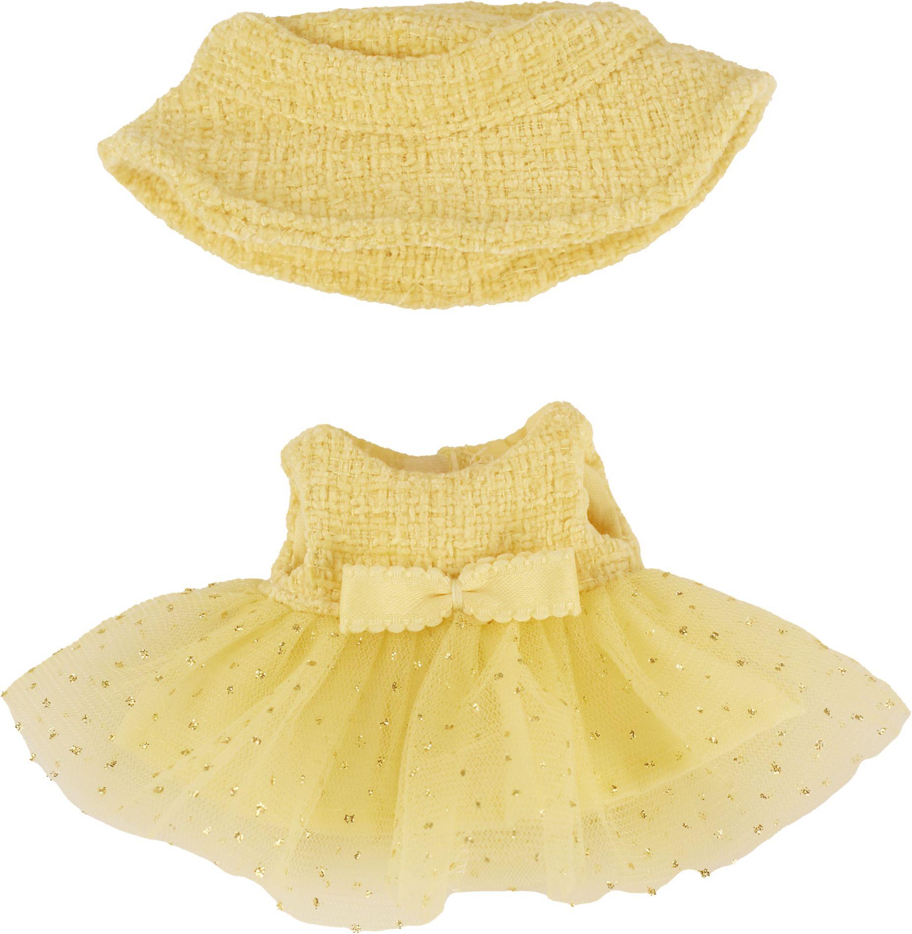 Das hellgelbe Bouclé-Kleid mit passendem Fischerhut bringt kleine Monster zum Strahlen. Durch die durchdachte Passform schauen die Öhrchen charmant durch den Hut, was den Look noch niedlicher macht. Der Kawaii Style sorgt dafür, dass das Outfit nicht nur süß, sondern auch absolut im Trend liegt. Passend für Labubus, Nunos und andere 15 cm große Monster. Outfit ohne Monster.
