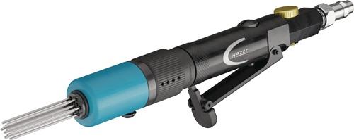 schonende Reinigung von verschmutzten und verrosteten Teilen insbesondere Reinigung von Bremsanlagen usw. · verstellbarer Nadelschlitten mit integrierter Nadelführung gewährleistet lange Standzeiten · 13 dünne Edelstahl Nadeln (Ø 1,3 mm) sorgen für beschädigungsfreie Bearbeitung sowie eine hochfeine Oberflächenstruktur · 28 mm schlanke, kurze Stiftform und freie Nadeln ermöglichen auch das Erreichen verwinkelter Bereiche · geeignet zur Bearbeitung von Edelstahl · 3000 Schläge/min · 360° verstellbarer Luftauslass · Sicherheitsauslösehebel · stufenlos einstellbare Leistung
