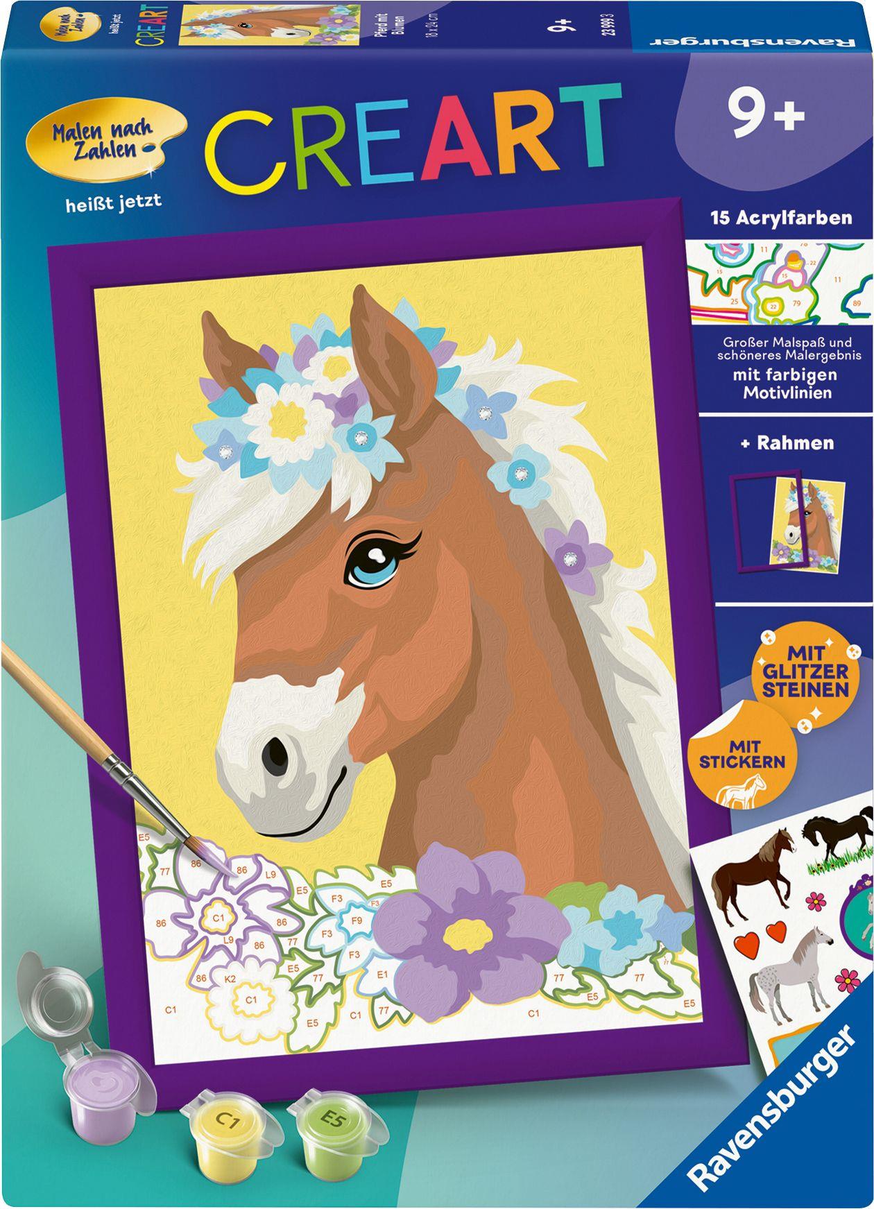 Farbige Motivlinien: Größerer Malspaß & ein schöneres Ergebnis!Dank der farbigen Motivlinien, können die Kinder das ganze Motiv Pferd mit Blumen und die Farben schneller erkennen. Der Pinsel hat eine gute Führung und so entsteht ein perfektes Bild.Die schönen Motive zum Ausmalen sind eine tolle Geschenkidee für Kinder ab 9 Jahren und eine schöne Dekoration. In diesem Malset sind bereits 15 fertig gemischte Acrylfarben enthalten. Verpackungsdesign kann abweichen. Mit Malen nach Zahlen von Ravensburger lernen die Kinder Flächen sorgfältig auszumalen, ihr Maltalent zu verbessern sowie feinmotorische Fähigkeiten zu entwickeln. Am Ende stehen Freude, Stolz und ein Erfolgserlebnis, das die Lust am Weitermalen weckt.Die Motive sind altersgerecht in drei Schwierigkeitsstufen umgesetzt: von einfachen Bildern mit wenigen, großen Malflächen bis hin zu Bildern mit vielen, kleinen Malflächen für Fortgeschrittene.Jedes Malset enthält alles, was Künstler zum Malen brauchen und es ist kein Mischen der Farben notwendig.Das Ravensburger Malen nach Zahlen Programm bietet eine große Motivauswahl für Kinder und Erwachsene.