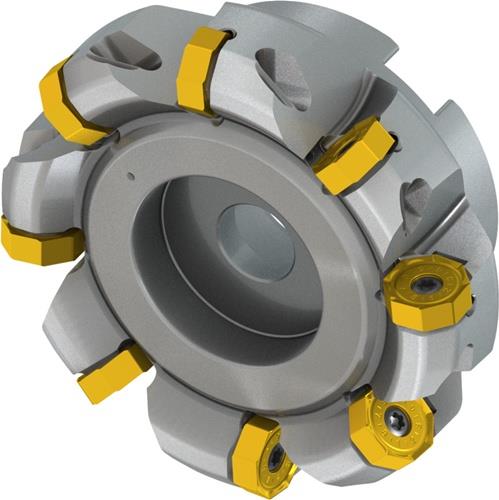 Planfräser mit doppelt negativer Geometrie welche 8 aus ONMX 0605.. · ONMX 0605..-W oder SNMX 1705.. doppelseitige Wendeschneidplatte · Schneiddurchmesser 100mm bis maximal 110,8mm mit 43° Anfahrwinkel und 32mm Bohrung gemäß DIN 8030-A · 50mm funktional und · durchgehende Kühlung und ungleicher Teilung zum Planfräsen und Entgratenmit einer maximalen Schnitttiefe von ON.. 4mm · SN.. 7mm