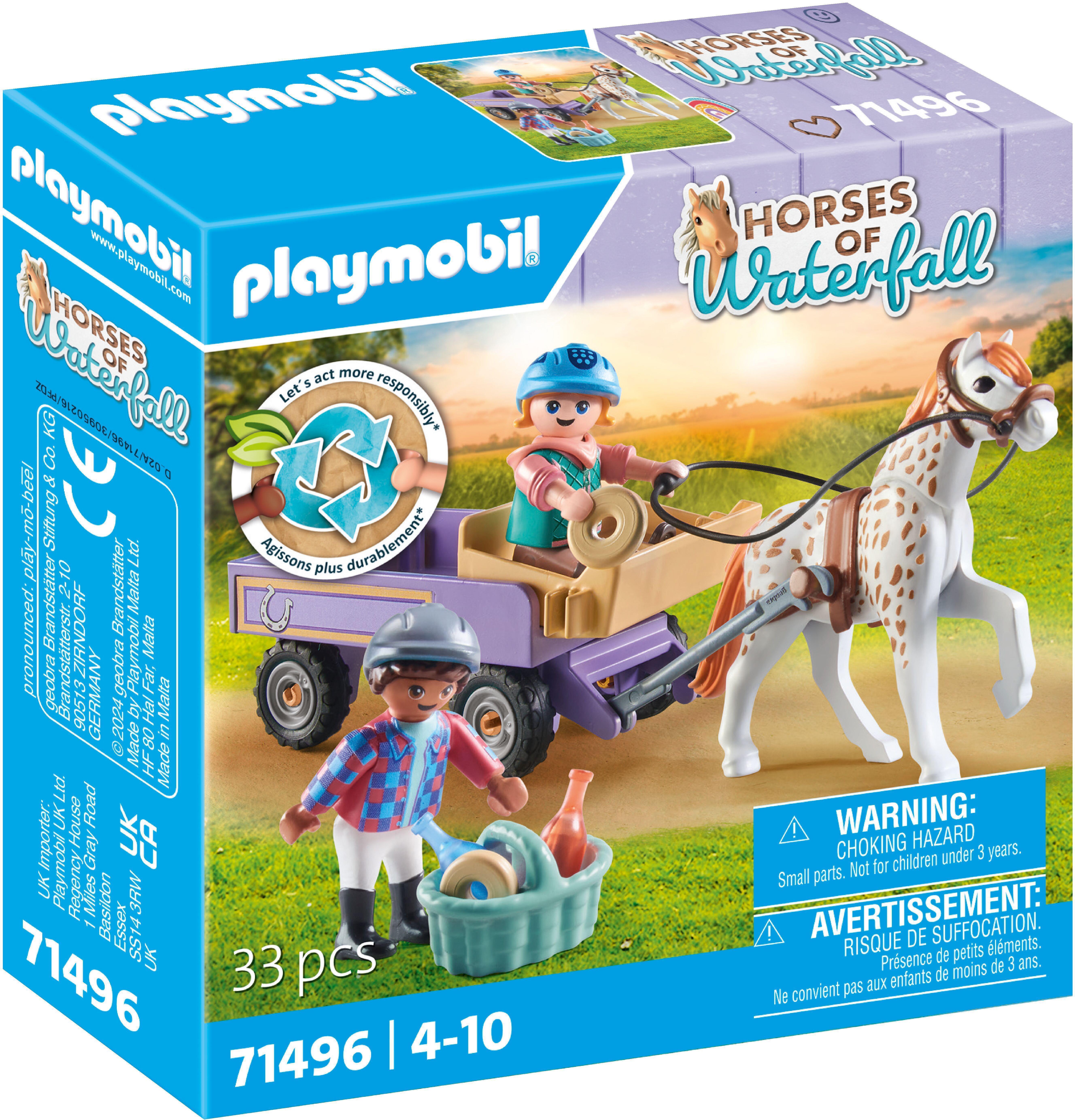 Mit der Ponykutsche unternehmen zwei junge Ponyfans einen Ausflug. Auf der Ladefläche finden Picknickkorb und auch Einkäufe Platz.