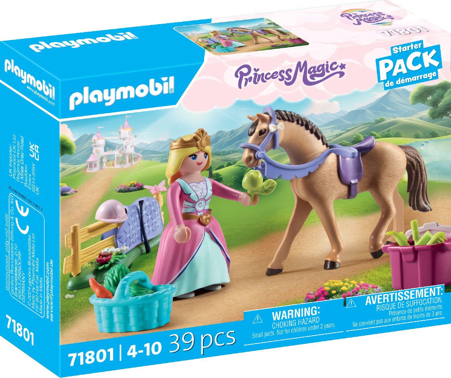 Mit großer Hingabe kümmert sich die elegante Prinzessin um ihr prächtiges Pferd. Die Prinzessin ist mit einem abnehmbaren Rock ausgestattet, sodass sie bequem auf ihrem treuen Ross reiten kann. Nach einem ausgiebigen Ausritt kann das Pferd mit einer saftigen Karotte und einer kuscheligen Decke belohnt werden, sobald der Sattel abgenommen ist. Für einen besonders festlichen Anlass lässt sich das Zaumzeug des Pferdes mit schimmernden Schleifen und Sternen verzieren.