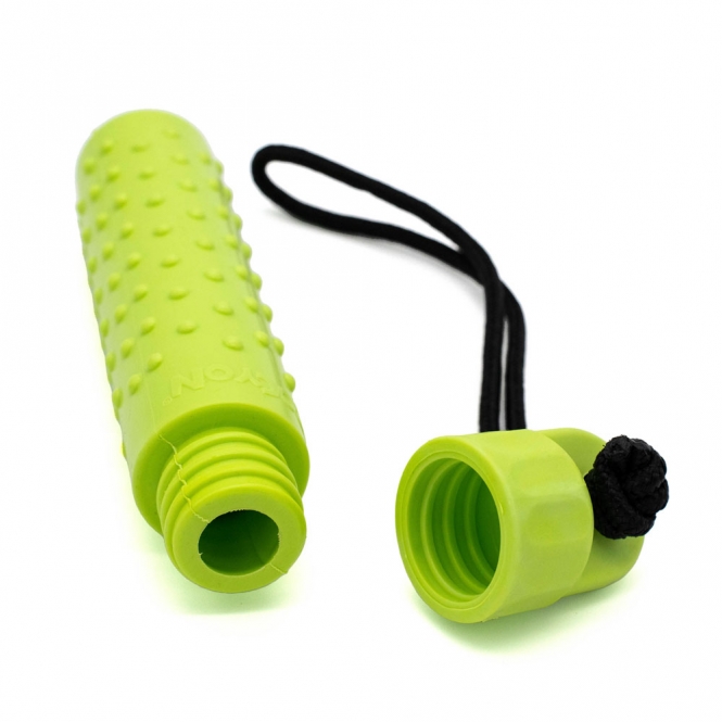 Der Deckel des Dummys lässt sich per Schraubverschluss abnehmen. So können die Belohnungsleckerchen einfach transportiert werden und sind sofort einsatzbereit. Durch die Handschlaufe lässt er sich außerdem gut tragen und werfen.