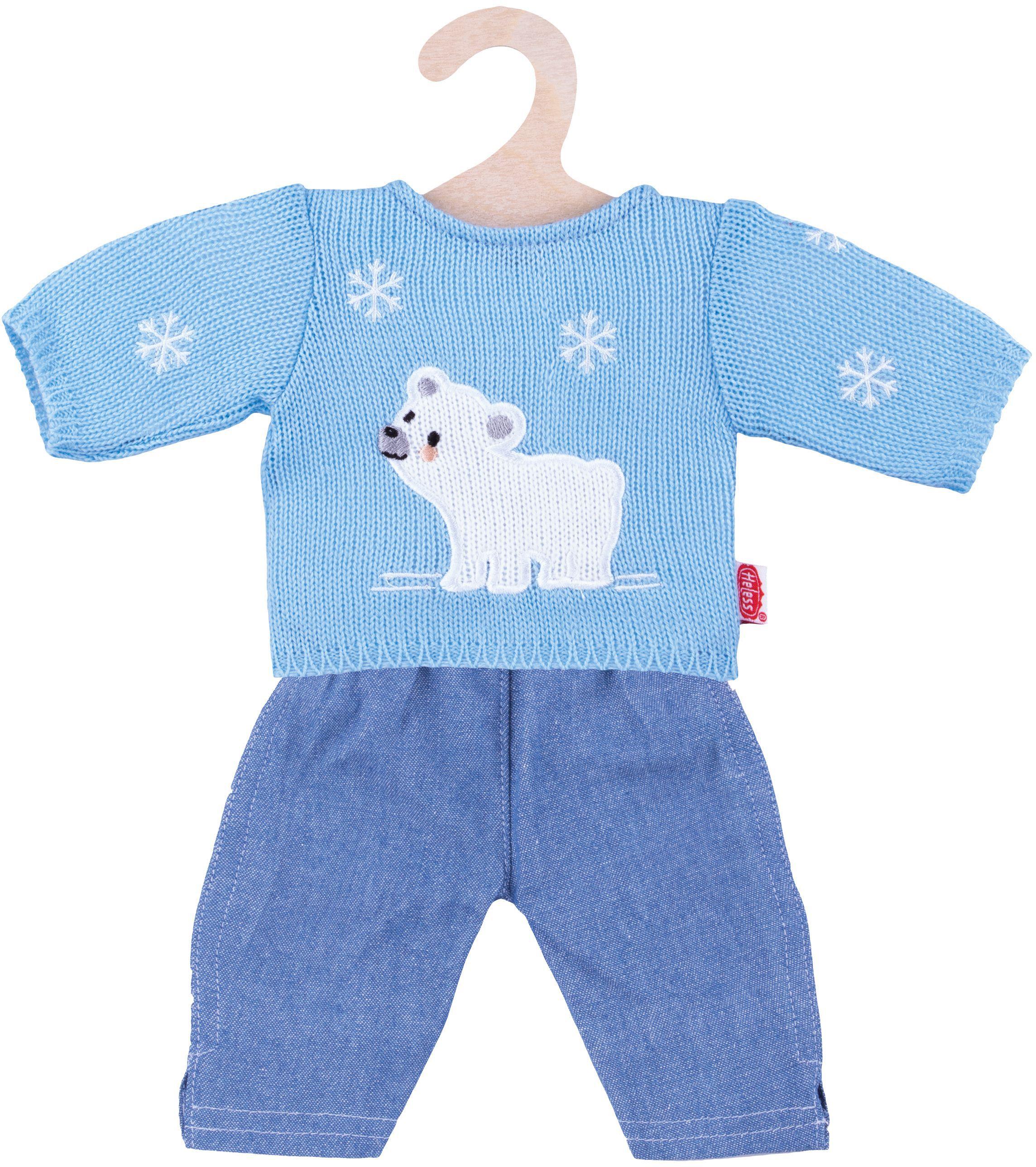 Mit diesem niedlichen Puppen-Outfit von Heless wird allen Puppeneltern gleich warm ums Herz. Der weiche Strickpullover ist mit einer aufwendigen Eisbären-Applikation und -Bestickung verziert. Die gemütliche Jeans mit blauen Nähten und guter Passform rundet das Outfit perfekt ab. Ein tolles Puppen-Bekleidungsset für die kältere Jahreszeit. Dieses Set passt den meisten marktgängigen Puppen der Größe 35-45 cm. Es ist auch in einer weiteren Ausführung für Puppengröße 28-35 cm erhältlich. Der Artikel wird auf einem Holzkleiderbügel geliefert.