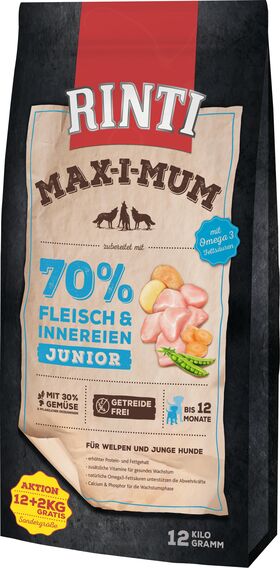 Das gesunde Wachstum junger Hunde wir durch den erhö-hten Rohprotein- und Rohfett und zusätzliche Vitamine gefö-rdert. Natürliche Omega3-Fettsäuren unterstützen die Abwehrkräfte. Auch das an die Wachstumsphase angepasste Calcium/Phosphor-Verhältnis wird bei diesem schmackhaften Trockenfutter berücksichtigt. Wie bei allen Maximum-Sorten wird diese Kost mit 65% frischem Fleisch und frischen Innereien zubereitet. Dies entspricht über 90% der eingesetzten Fleischmaterialien. Dadurch wird der natürliche Fleischgeschmack gefö-rdert und die Nahrungsverwertung unterstützt.