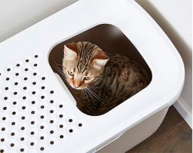Die sehr moderne Katzentoilette Hop In verfügt über einen Einstieg an der Oberseite, durch den das Herausschaufeln von Katzenstreu minimiert wird.