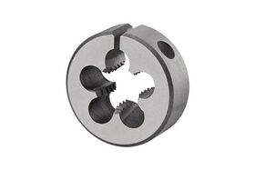 Einstellbares geschlitztes Schneideisen · Feingewinde UNF 3/4? mit 16 Gängen / Inch · um das Drehmoment beim Schneiden von Hand zu reduzieren · können geteilte Schneideisen in kleinen Schritten eingestellt werden · bis zu einem Maximum von ungefähr 0.006? · Abmessungen nach BS 1127:1950 Standard mit 1.1/2? Außendurchmesser und 1/2? Dicke · HSS mit blanker Oberfläche Gewinden in Baustahl und Kohlenstoffstahl · Ferritischer Edelstahl und Grauguss · Temperguss · duktiles und verdichteter Graphitguss