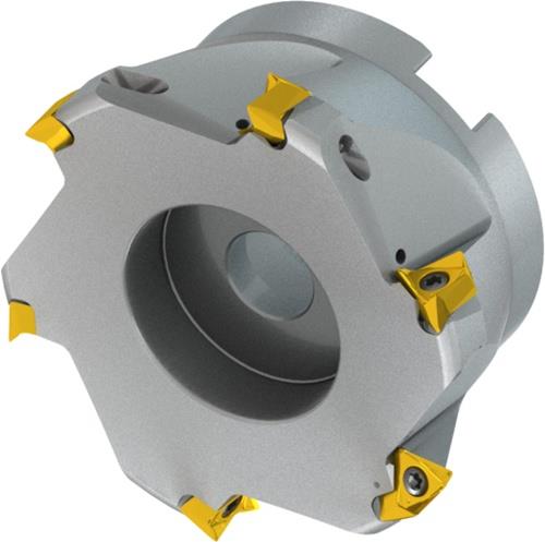 Eck-und Planfräser mit doppelt negativer Geometrie welche 6 aus TNGX 1606.. doppelseitige Wendeschneidplatte · Schneiddurchmesser 100mm mit 90° Anfahrwinkel und 32mm Bohrung gemäß DIN 8030-A · 50mm Einsatzlänge · durchgehende Kühlung und ungleicher Teilung zum Planfräsen · flachen Schulterfräsen · flachen Nutfräsen und Spiralfräsen in vorbearbeiteten Löchern