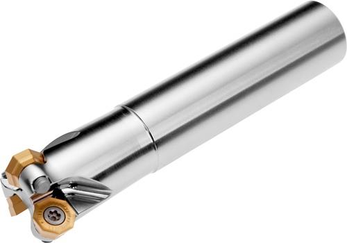 Kopier-Planfräser mit positiver/negativer Geometrie zum spannen von 3 Stück OD.T 05IM · RD.T 12IM oder SD.T 12IM einseitigen Wendeschneidplatten · Schnittdurchmesser 32.6mm mit 45 / 90° Anstellwinkel und 32mm Zylinderschaft gemäß DIN 1835A · 45mm Funktionslänge 150mm Gesamtlänge · Kühlkanalbohrung zum Planfräsen · Kopierfräsen · flachen Schulterfräsen · flachen Nutfräsen · Rampen · Helikalen Fräsen · Tauchfräsen · progressiven Eintauchen und Entgratfräsen mit einer maximalen Schnitttiefe von 3.0 (6.0/10.0)mm