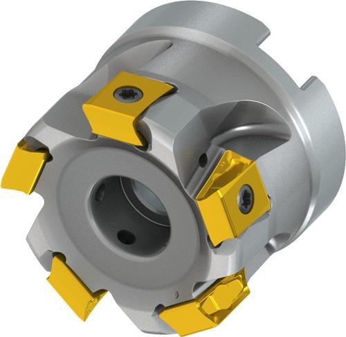Eckfräser mit doppelt negativer Geometrie welche 5 aus LNEX 1210.. doppelseitige Wendeschneidplatte · Schneiddurchmesser 50mm mit 90° Anfahrwinkel und 22mm Bohrung gemäß DIN 8030-A · 40mm funktional und · durchgehende Kühlung zum Planfräsen · flachen Schulterfräsen · tiefen Schulterfräsen · Tauchfräsen und flachen Nutfräsen mit einer maximalen Schnitttiefe von 10mm