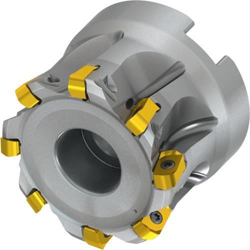 Hochvorschubsfräser mit doppelt negativer Geometrie welche 8 aus BNGX 10T3.. Wendeschneidplatte · Schneiddurchmesser 45mm bis maximal 50mm mit 29° Anfahrwinkel und 22mm Bohrung gemäß DIN 8030-A · 40mm funktional und · durchgehende Kühlung und ungleicher Teilung zum Planfräsen · flachen Schulterfräsen · Tauchfräsen · Kopierfräsen · Rampen · progressiven Tauchfräsen und helikalen Fräsen mit einer maximalen Schnitttiefe von 1mm