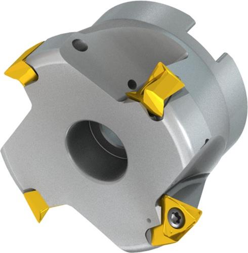 Eck-und Planfräser mit doppelt negativer Geometrie welche 4 aus TNGX 1606.. doppelseitige Wendeschneidplatte · Schneiddurchmesser 63mm mit 90° Anfahrwinkel und 22mm Bohrung gemäß DIN 8030-A · 40mm Einsatzlänge · durchgehende Kühlung und ungleicher Teilung zum Planfräsen · flachen Schulterfräsen · flachen Nutfräsen und Spiralfräsen in vorbearbeiteten Löchern