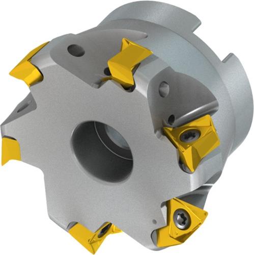 Eck-und Planfräser mit doppelt negativer Geometrie welche 6 aus TNGX 1606.. doppelseitige Wendeschneidplatte · Schneiddurchmesser 63mm mit 90° Anfahrwinkel und 22mm Bohrung gemäß DIN 8030-A · 40mm Einsatzlänge · durchgehende Kühlung und ungleicher Teilung zum Planfräsen · flachen Schulterfräsen · flachen Nutfräsen und Spiralfräsen in vorbearbeiteten Löchern